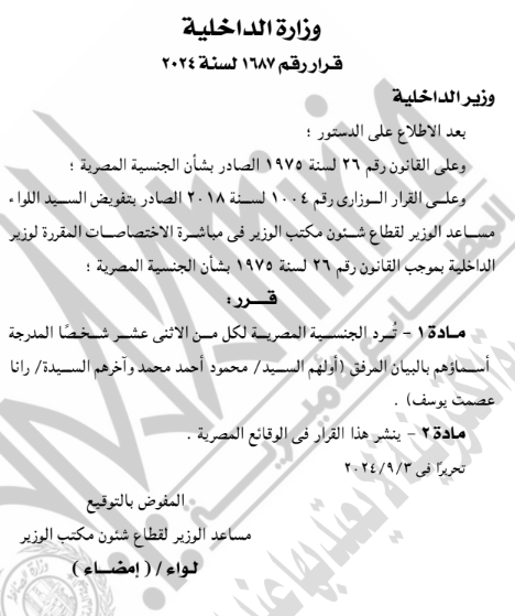 نشرت الجريدة الرسمية اليوم الأربعاء، قرار وزارة الداخلية برد الجنسية المصرية لـ 36 مواطنًا مرفق أسمائهم في الكشوف التالية.