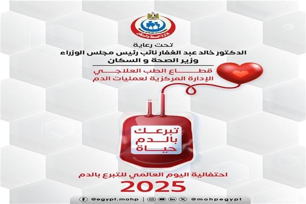 أعلنت وزارة الصحة والسكان، اطلاق حملة قومية للتبرع بالدم والتوعية بأهمية التبرع، وذلك تحت رعاية الدكتور خالد عبدالغفار، نائب رئيس مجلس الوزراء للتنمية البشرية ووزير الصحة والسكان، يوم السبت 28 يونيو 2025، تحت شعار «تبرعك بالدم حياة» ضمن فعاليات اليوم العالمي للتبرع بالدم.