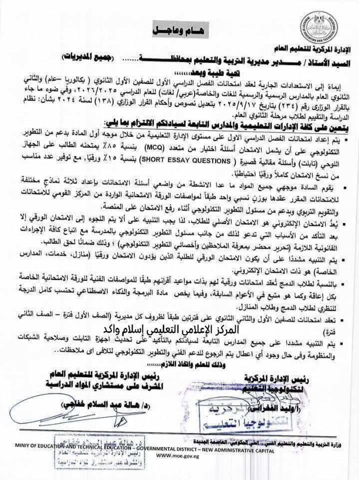 ونص الخطاب، على أن يتم إعداد امتحانات الفصل الدراسي الأول على مستوى الإدارة التعليمية من خلال موجه أول المادة بدعم من التطوير التكنولوجي على أن يشمل الامتحان أسئلة اختيار من متعدد (MCQ) بنسبة %85 يمتحنه الطالب على الجهاز اللوحي (تابلت) وأسئلة مقالية قصيرة ( SHORT ESSAY QUESTIONS) بنسبة %15 ورقيا، مع توفير عدد مناسب من نسخ الامتحان كاملاً ورقيا احتياطيا.