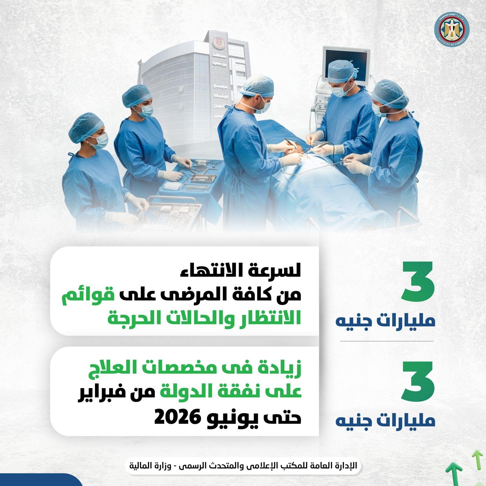 وأشار وزير المالية، إلى أن هناك ٣ مليارات جنيه لسرعة الانتهاء من قوائم انتظار المرضى والحالات الحرجة لتخفيف آلامهم وأسرهم، موضحًا أن هناك ٣ مليارات جنيه زيادة أيضًا في مخصصات العلاج على نفقة الدولة لمحدودي الدخل، ممن ليس لهم تغطية تأمينية في الفترة من فبراير حتى يونيو ٢٠٢٦، موضحا أن فخامة الرئيس وجه بعلاج كل الحالات الحرجة على نفقة الدولة حتى نحتفل بشفائها مع حلول عيد الفطر.