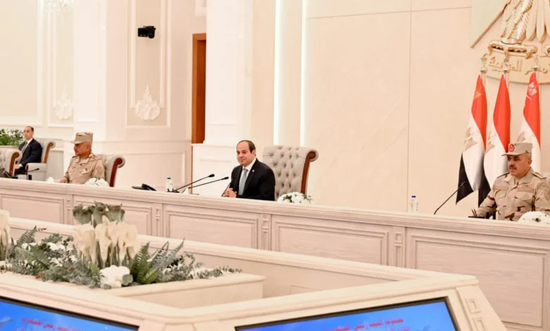 وقال الرئيس السيسى:”الحقيقة انا متابع الأنشطة كلها ومطمئن، ولكن عايز اوضح لكم نقطة مهمة جداً القوات المسلحة كانت دايما هي ركيزة الاستقرار فى مصر وزي ما انتم شايفين المنطقة مضطربة جدًا وبتمر بأحداث صعبة، ومصر هي عنصر الاستقرار المهم علي مدي السنين اللي فاتت وإن شاء الله السنين القادمة من خلال سياسة متوازنة تتسم بالاعتدال والصبر فى مواجهة الأحداث اللي بتتم والتطورات اللي بتتم، وزي ما انتم شايفين على الاتجاهات الاستراتيجية التلاتة الغربية والجنوبية وحتى الشرقية لكن ادارتنا المتزنة دي كانت ساهمت مساهمة كبيرة جدًا فى الحفاظ علي الاستقرار”.