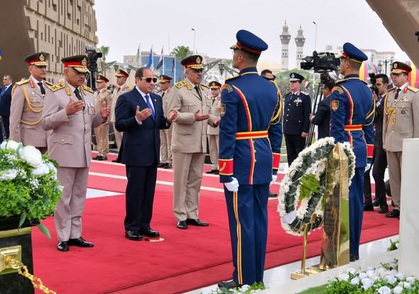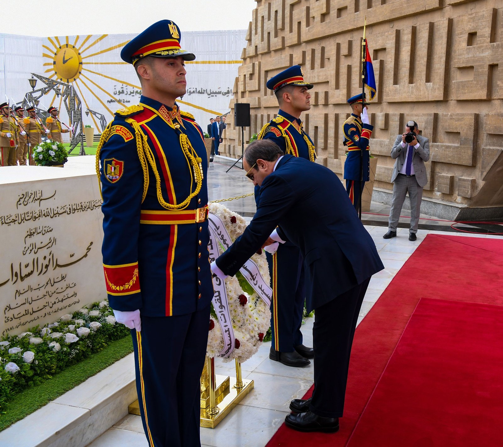 وصرح المتحدث الرسمي باسم رئاسة الجمهورية أن السيد الرئيس توجه كذلك إلى قبر الرئيس الراحل محمد أنور السادات، وقام بوضع إكليلا من الزهور وقراءة الفاتحة ترحمًا على روحه الطاهرة.