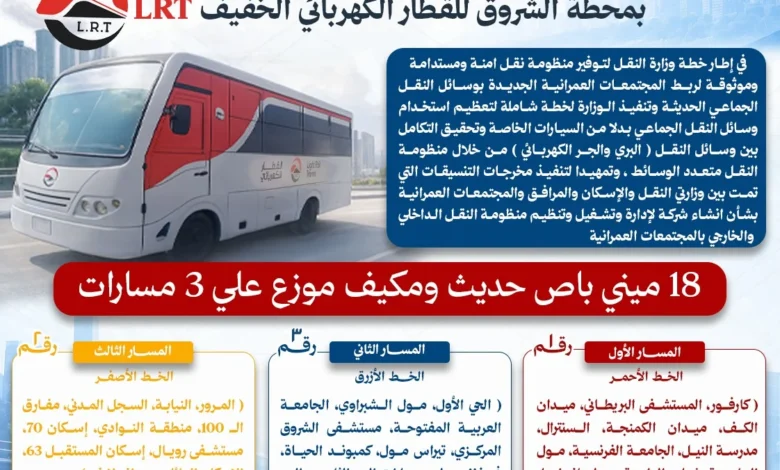 تتضمن المنظومة الجديدة دفع 18 ميني باص حديث ومكيف، موزعة على 3 مسارات رئيسية، وذلك في إطار تنفيذ مخرجات التنسيق بين وزارتي النقل والإسكان والمرافق والمجتمعات العمرانية، لتعظيم استخدام وسائل النقل الجماعي بدلاً من السيارات الخاصة وتحقيق التكامل بين وسائل النقل البري والجر الكهربائي.