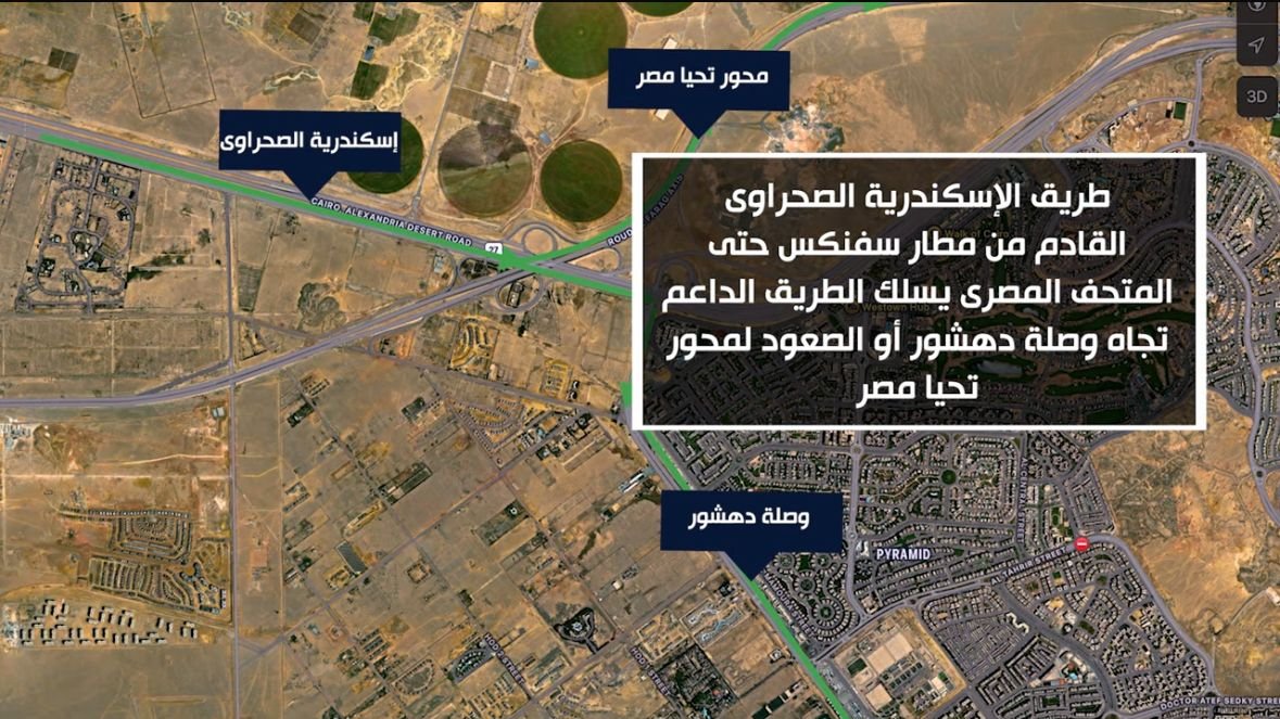 – طريق الإسكندرية الصحراوى: القادم من مطار سفنكس حتى المتحف المصرى.. يسلك الطريق الداعم تجاه وصلة دهشور أو الصعود لمحور تحيا مصر.