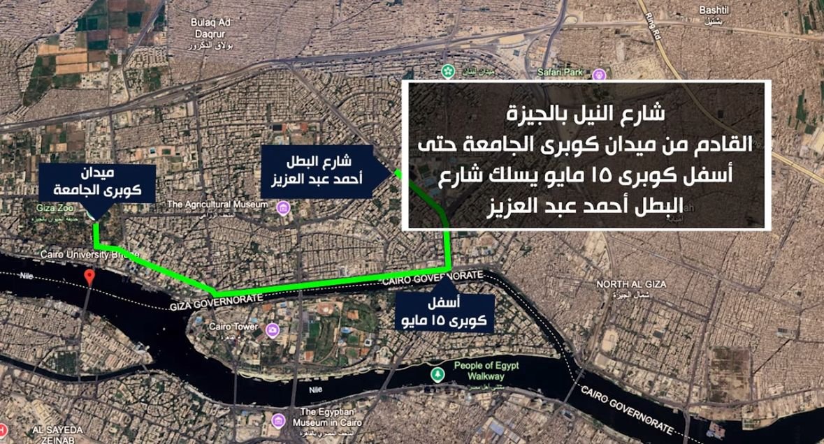 – شارع النيل بالجيزة: القادم من ميدان كوبرى الجامعة حتى أسفل كوبرى ١٥ مايو .. يسلك شارع البطل أحمد عبد العزيز.
