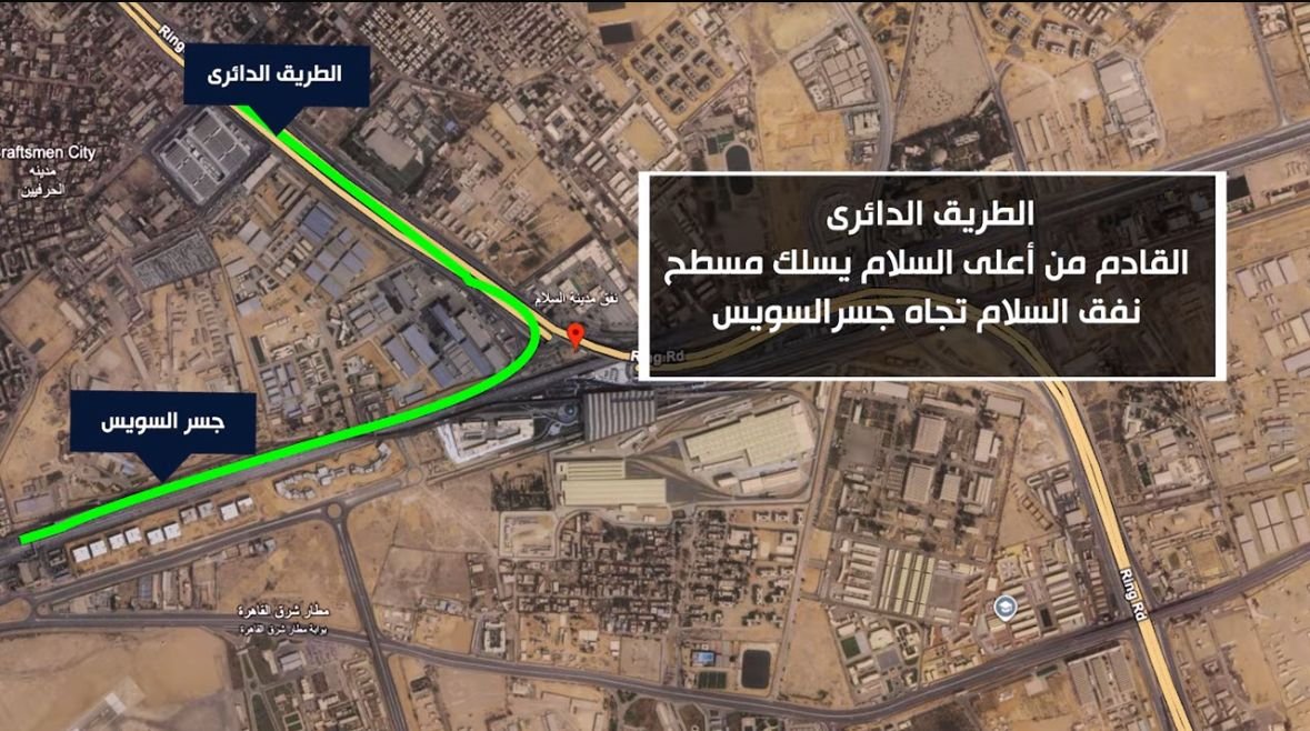 – الطريق الدائرى: القادم من أعلى السلام.. يسلك مسطح نفق السلام تجاه جسر السويس.