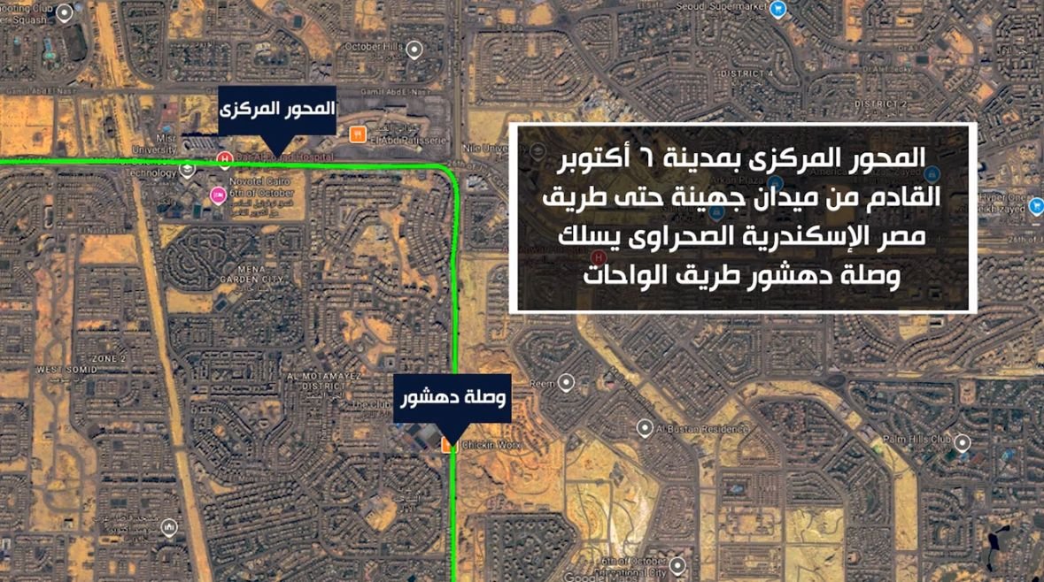 – المحور المركزى بمدينة ٦ أكتوبر: القادم من ميدان جهينه حتى طريق مصر الإسكندرية الصحراوى.. يسلك وصلة دهشور طريق الواحات.