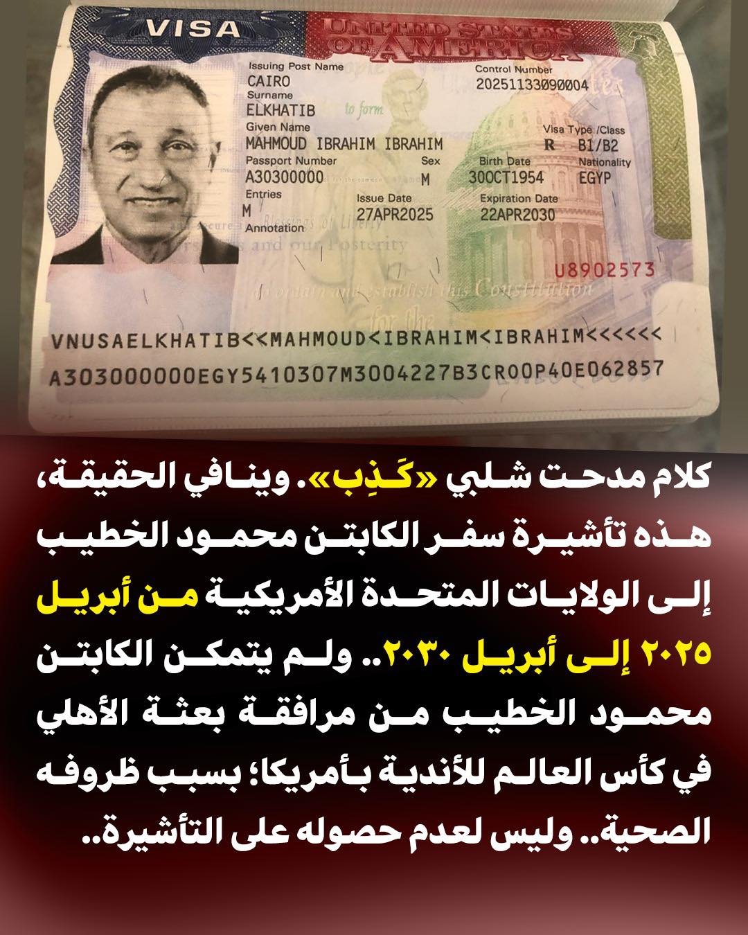 وكتب جبر عبر صفحته الرسمية على موقع التواصل الاجتماعي «فيسبوك»: «كلام مدحت شلبي كذب وينافي الحقيقة.. وهذه تأشيرة سفر الكابتن محمود الخطيب إلى الولايات المتحدة من أبريل 2025 حتى أبريل 2030».