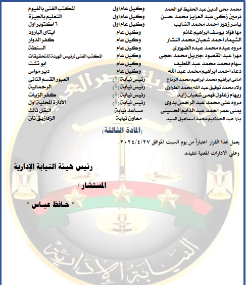 أصدر المستشار حافظ عباس رئيس هيئة النيابة الإدارية، حركة تنقلات بقرار رقم 155 لسنة 2024 م وقرار وزير العدل رقم 8341 لسنة 2012 بتعيين الإدارات وفروعها والنيابات التى تتكون منها النيابة الإدارية واختصاص ومقر كل منها وبعد موافقة المجلس الإعلى للنيابة الإدارية بجلسته رقم 2024/4/23 م وهم: