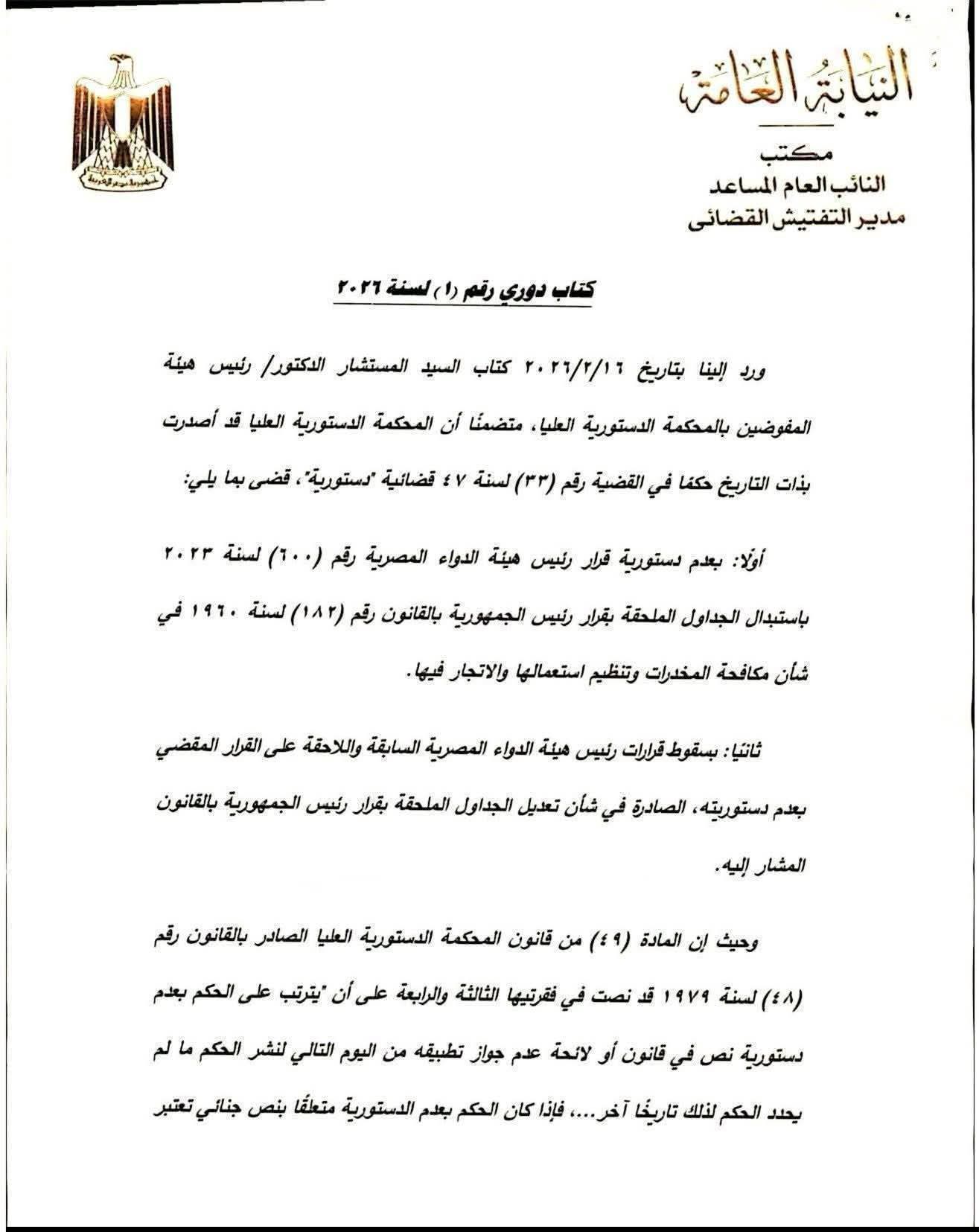 وأوضح الكتاب الدوري أنه ورد إلى النيابة كتاب رئيس هيئة المفوضين بالمحكمة الدستورية العليا بتاريخ 16 يناير 2026، متضمنًا صدور حكم في القضية رقم (33) لسنة 47 قضائية “دستورية”. وقضى الحكم بعدم دستورية قرار رئيس هيئة الدواء المصرية رقم (600) لسنة 2023، والمتعلق باستبدال الجداول الملحقة بقرار رئيس الجمهورية بالقانون رقم (182) لسنة 1960 الخاص بمكافحة المخدرات وتنظيم استعمالها والاتجار فيها.