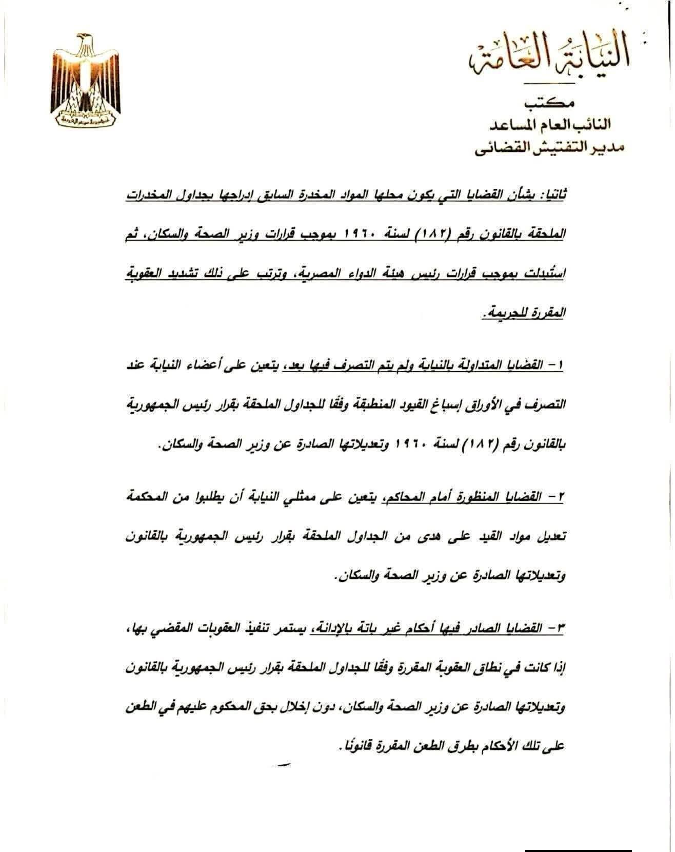 أصدرت النيابة العامة المصرية كتابًا دوريًا رقم (1) لسنة 2026، موجّهًا إلى أعضاء النيابة، وذلك في ضوء الحكم الصادر عن المحكمة الدستورية العليا بشأن دستورية بعض الإجراءات المتعلقة بتعديل جداول المواد المخدرة.