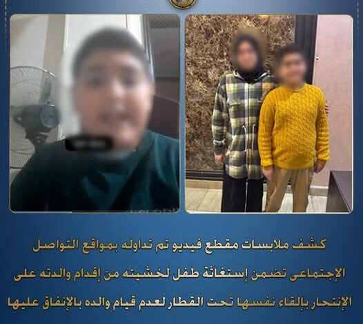كشفت الأجهزة الأمنية ملابسات مقطع فيديو تم تداوله عبر مواقع التواصل الاجتماعي، تضمن استغاثة طفل خوفًا من إقدام والدته على الانتحار بإلقاء نفسها تحت القطار، بسبب امتناع والده عن الإنفاق عليها.
