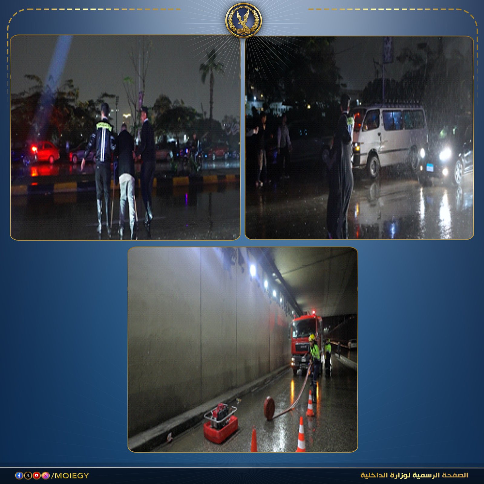 واصلت أجهزة وزارة الداخلية تكثيف تواجدها الميداني بكافة الشوارع والميادين الرئيسية، في إطار جهودها لمواجهة موجة الطقس السيئ التي تشهدها عدد من المحافظات، والعمل على تسيير الحركة المرورية ومنع حدوث تكدسات.