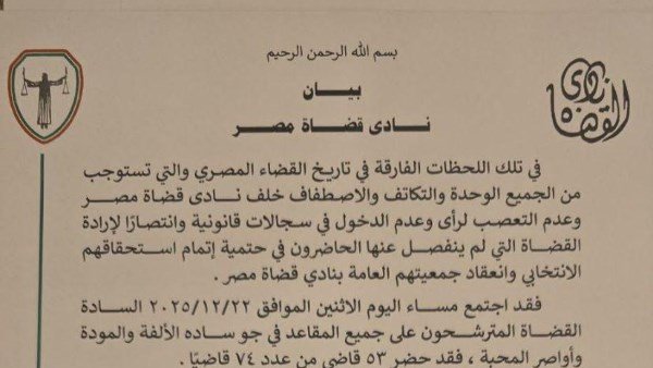 أكد نادي قضاء مصر أنه في تلك اللحظات الفارقة في تاريخ القضاء المصري والتي تستوجب