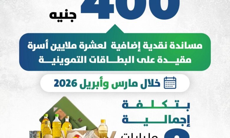 وكان أحمد كجوك ، وزير المالية، قد أكد إنه سيتم تقديم دعم إضافي للسلع التموينية ضمن حزمة الحماية الاجتماعية الجديدة بواقع 400 جنيه على كل بطاقة تموين بقيمة 8 مليارات جنيه لدعم 10 ملايين أشرة .